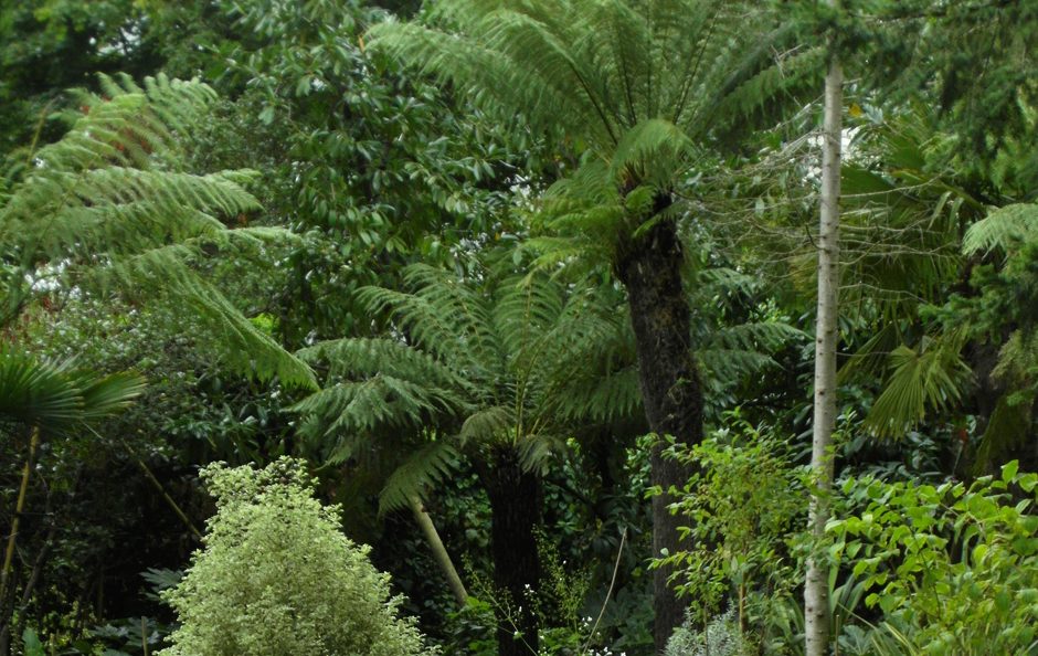 Tree ferns, palm trees, metal square pond, wooden bridge